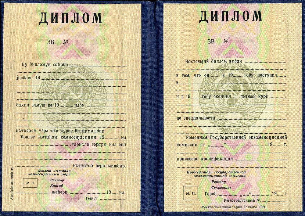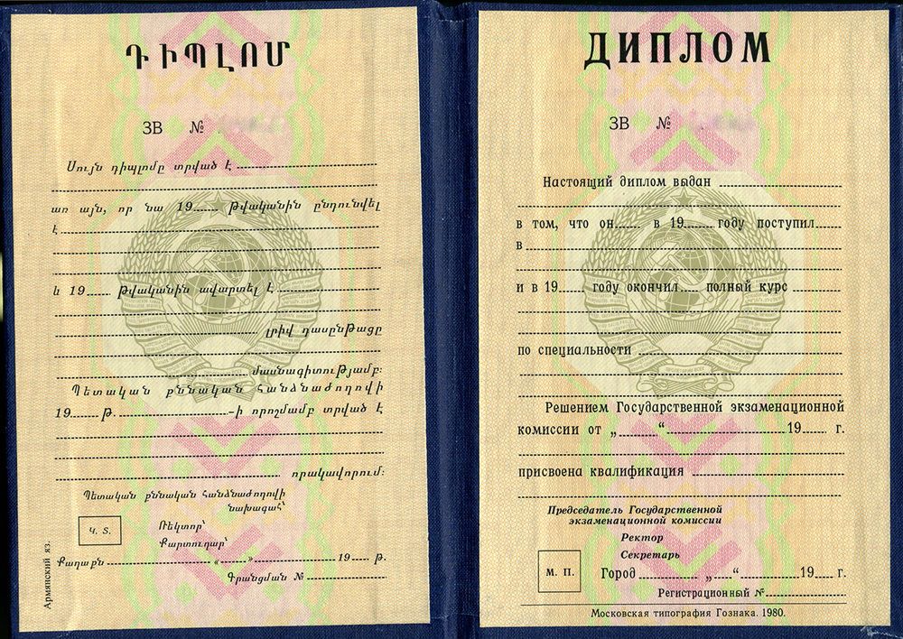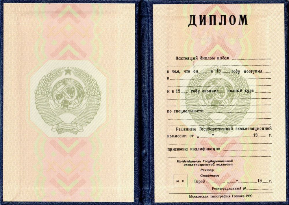 - год выпуска – у нас до сих пор хранится запас государственных бланков для советских дипломов образцов разных лет, так что выберите любой год окончания учебы, выглядящий логично в контексте вашей жизни;